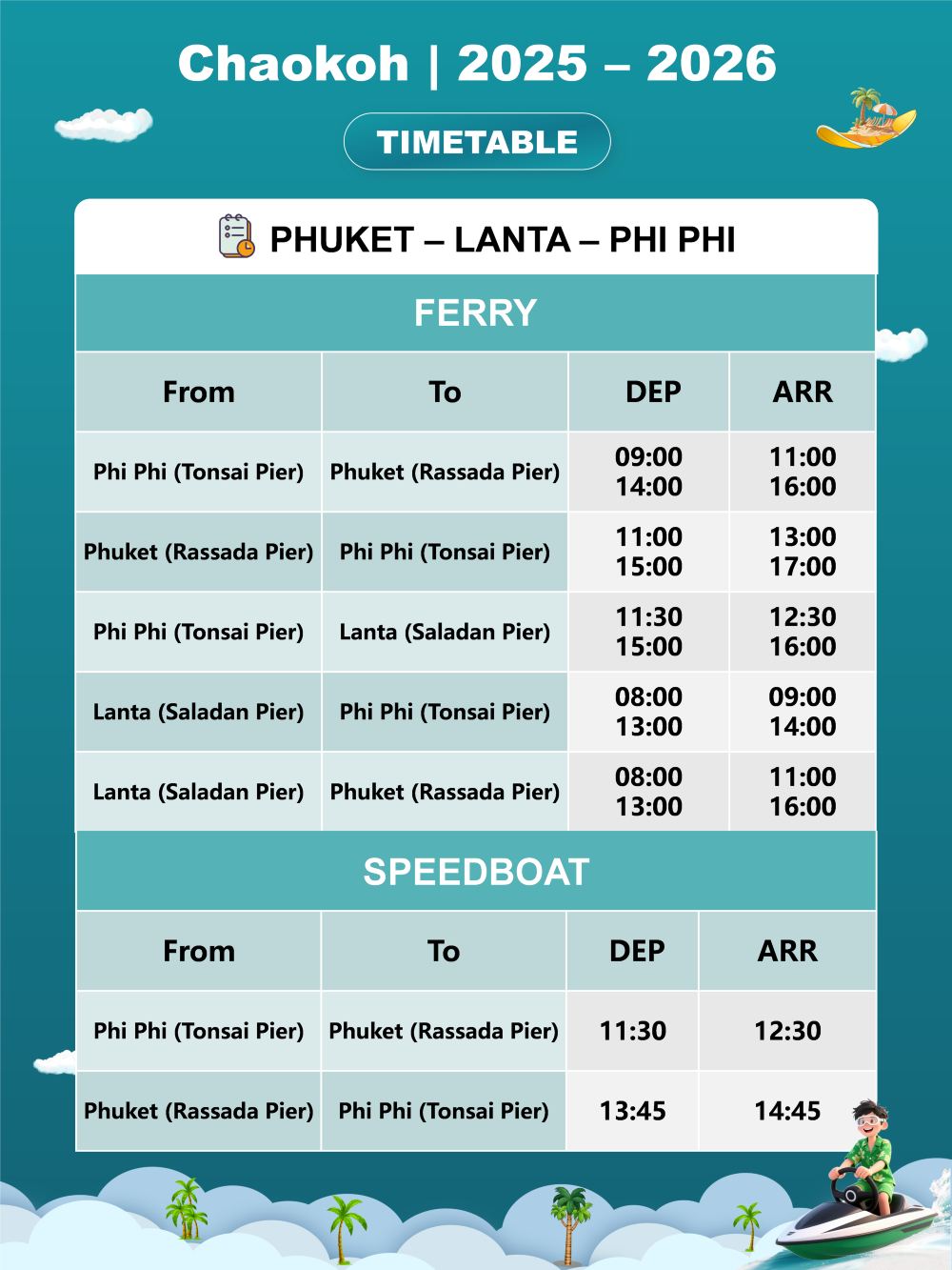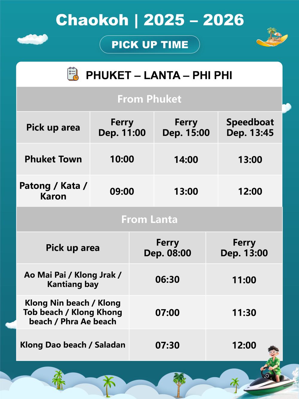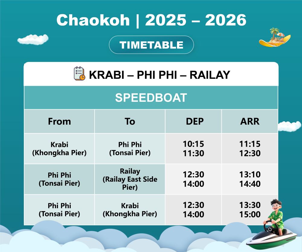 4) 往返布吉及蘭塔的乘客將於皮皮島轉船,需時1.5小時(15:00出發)。每人需支付20泰銖登岸費用。