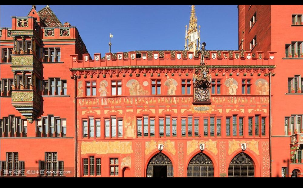 ▲ 巴塞爾市政廳是瑞士巴塞爾的代表性建築,位於市集廣場。它是一座紅色砂岩建築,擁有獨特的塔樓。自1290年起,這裡就是巴塞爾的政治中心。1356年毀於地震後,1504-1514年進行了擴建。1521年,小漢斯·霍爾拜因負責繪畫,其庭院側面牆的《約沙法告誡法官》《希律王》等畫作均出自漢斯博克之手。塔樓上的畫則由威廉·巴爾梅爾創作於1901年。市政廳內牆面繪有精美彩繪,還懸掛著十二枚當時加入瑞士聯邦的十二個州的徽章,每天向公眾開放,是遊客了解巴塞爾歷史文化的重要窗口。