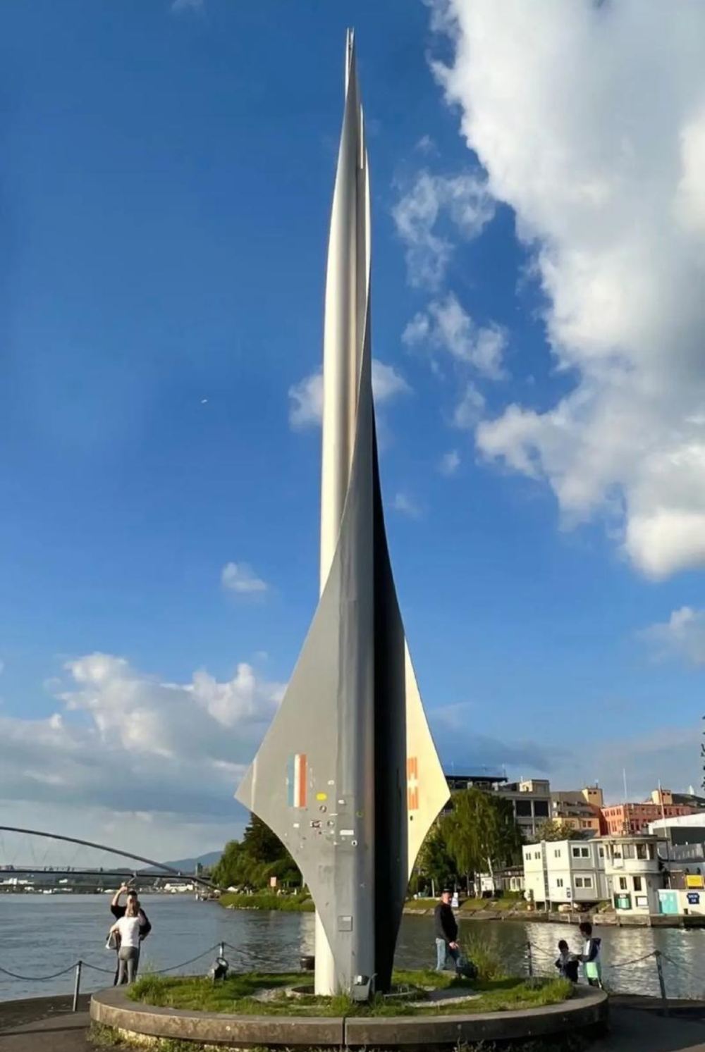 ▲ 瑞士三國國界交界紀念碑位於巴塞爾市郊的萊茵河畔,是瑞士、法國、德國三國地理交界的標誌性景點。 紀念碑由瑞士建築師、雕塑家威廉·明格建造,於1957年建成,旨在紀念二戰結束後歐洲的新開始。它主體由三根立柱構成,也像一隻直指天空的火箭,底部的三翼分別標識有三國的國旗,象徵著和平共處與地理融合。紀念碑高約15米,重超8噸,由1.5厘米厚的鐵板製成。其位於萊茵河畔的觀景平台,遊客可在此俯瞰河流蜿蜒與三國風光,還能沿萊茵河步行至附近的法國小鎮或德國城市,感受不同風情。