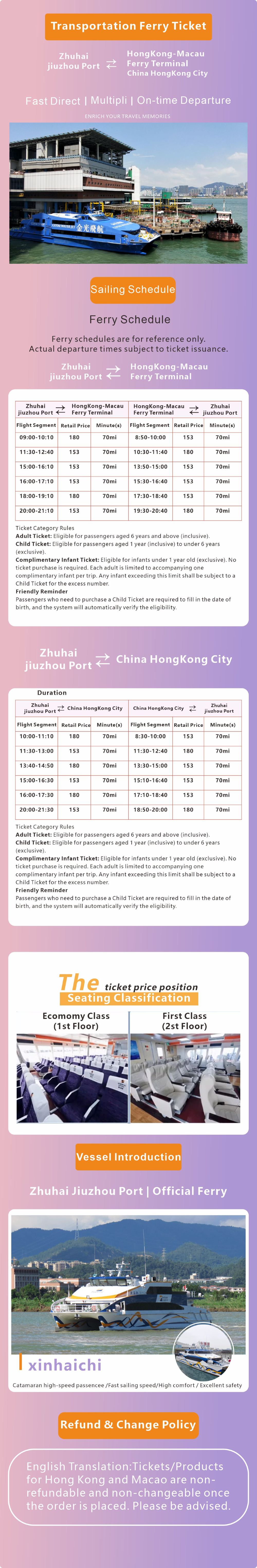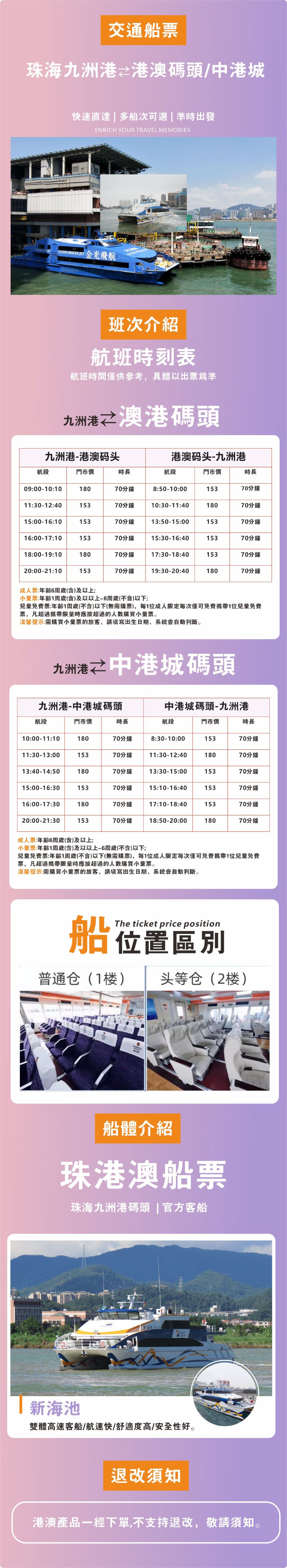 【珠海九洲港至香港尖沙咀/中港城碼頭】珠海九洲港至香港尖沙咀/中港城碼頭至珠海九洲港/單程/往返船票