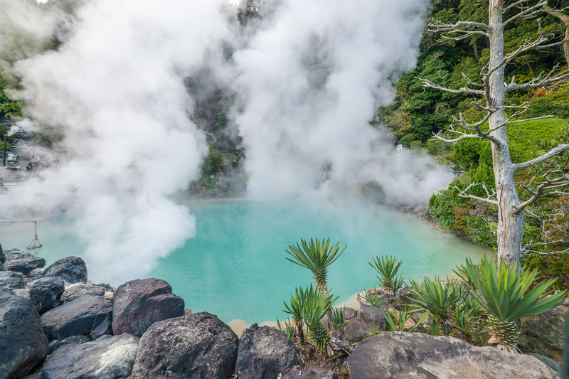 別府八大地獄之一,湛藍溫泉池霧氣繚繞,可品嚐溫泉蛋,感受地熱奇觀。