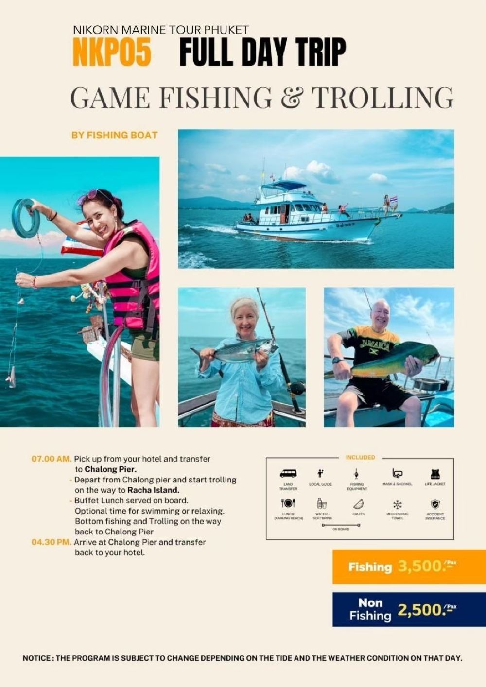 2.費用包含:布吉部分酒店接送、午餐、飲品、水果英文導遊、救生衣、海釣設備。