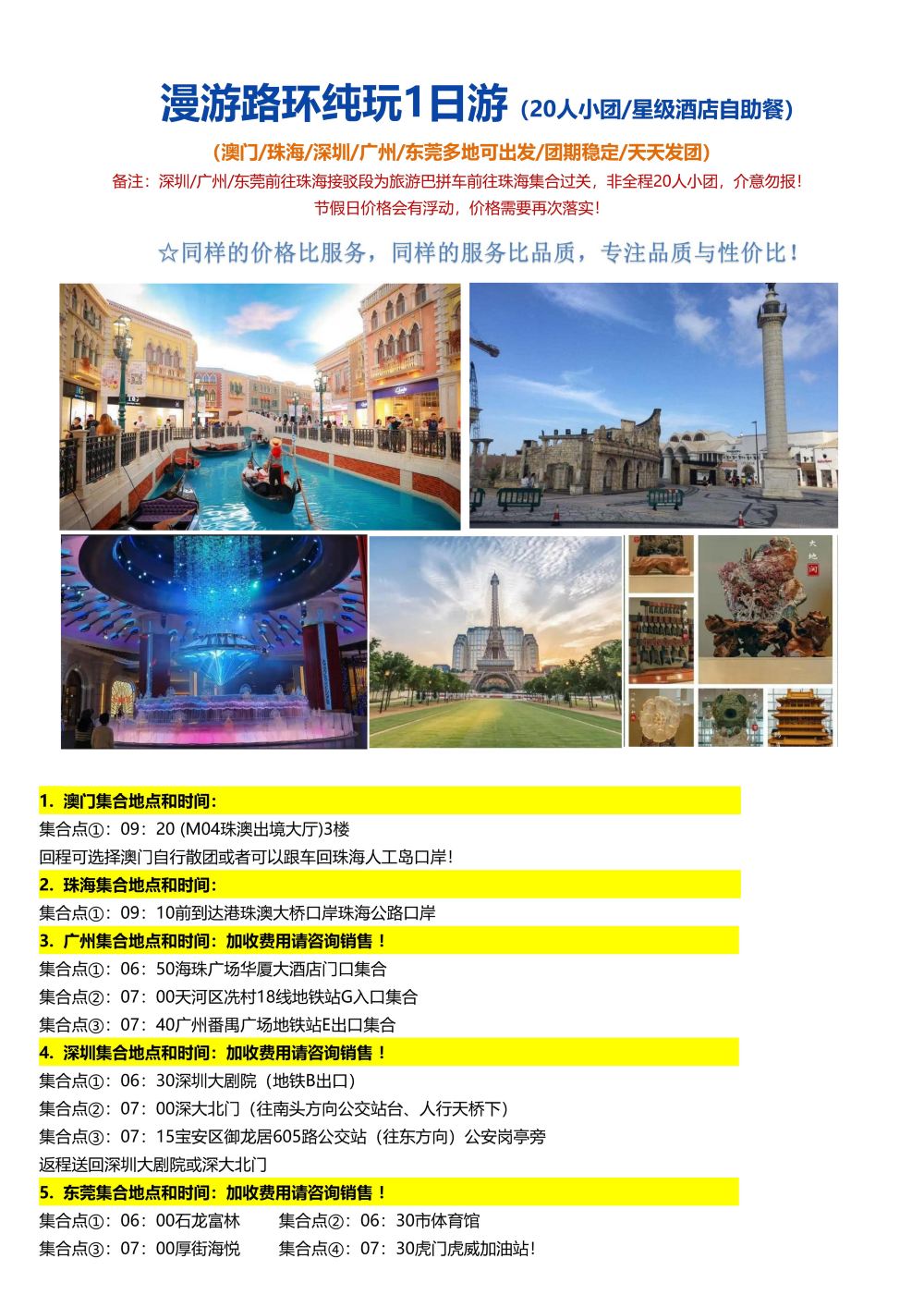 備註:深圳/廣州/東莞前往珠海接駁段為旅遊巴拼車前往珠海集合過關,非全程20人小團,介意勿報!