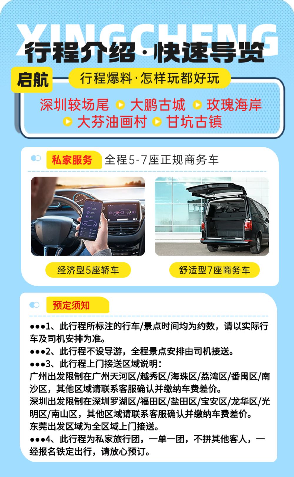 私家旅行:一單一團,不拼客,專屬旅行; 品質服務:車上門接送,專職司機護航