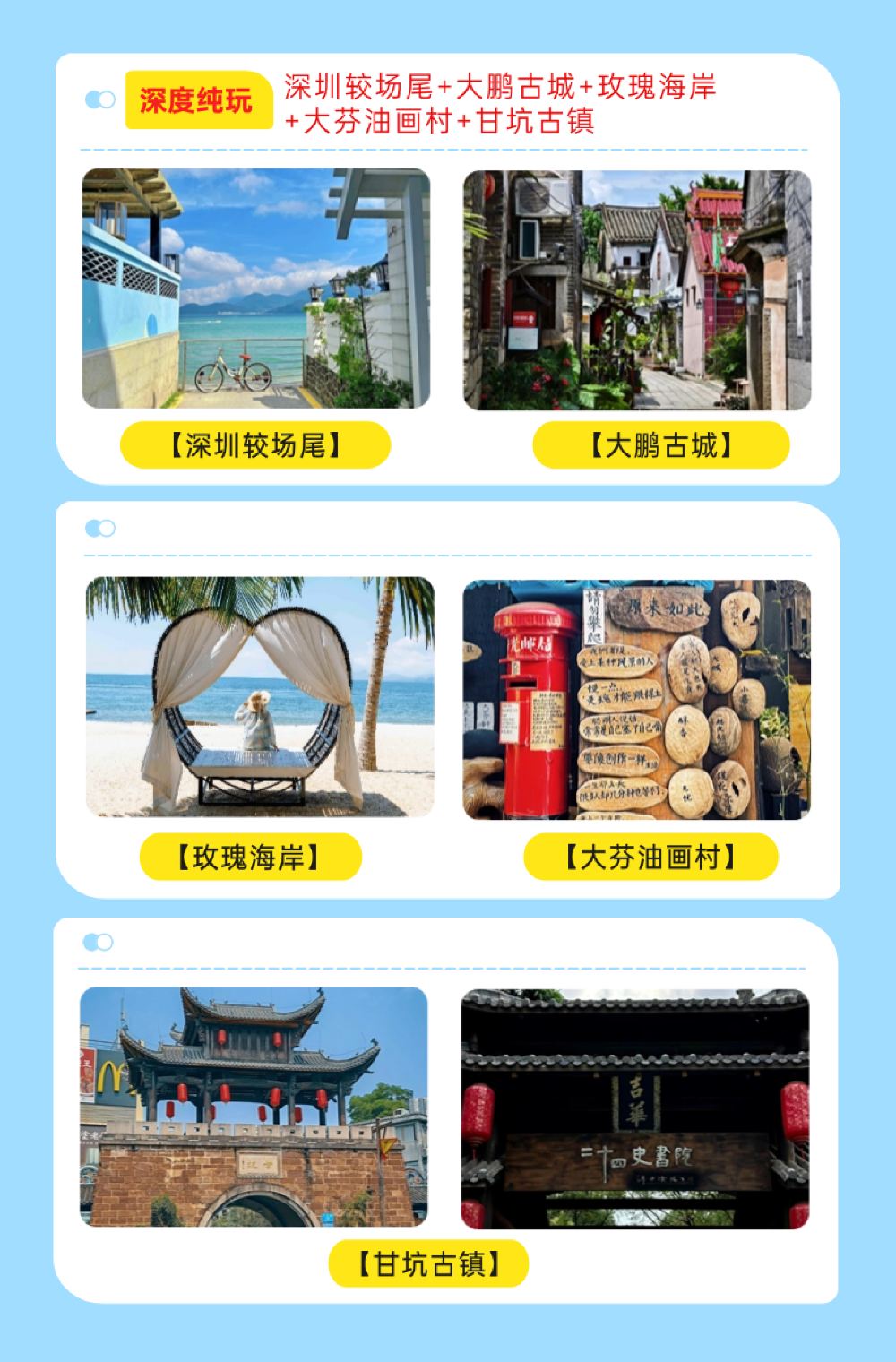 玫瑰海岸浪漫天堂,闖入油畫裡的治癒藍海;世外桃源客家小鎮詩意棲居—甘坑古鎮;油畫小鎮藝術天堂深圳