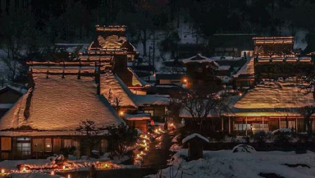 冬日暮色中,世界遺產合掌造幻化成童話雪屋,點燈儀式恍如夢境,一生必看的浪漫瞬間。
