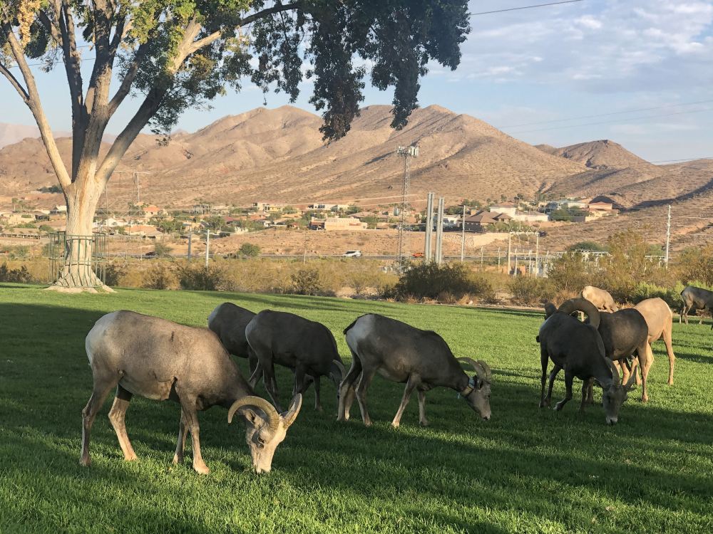 ▲ 位於胡佛水壩附近的海明威公園,是一個充滿寧靜與自然野趣的觀景休憩點。這裡地勢開闊,可以遠眺米德湖湛藍的湖面與周圍的沙漠山脈,景觀宜人。公園的亮點是常年棲息於此的野生大角羊(Desert Bighorn Sheep),牠們成群結隊在草坪上悠閒覓食,與遊客近距離相處。無論是短暫停留欣賞湖景、呼吸清新的空氣,還是捕捉人與自然和諧共處的畫面,海明威公園都為旅程增添一份愜意與溫馨。