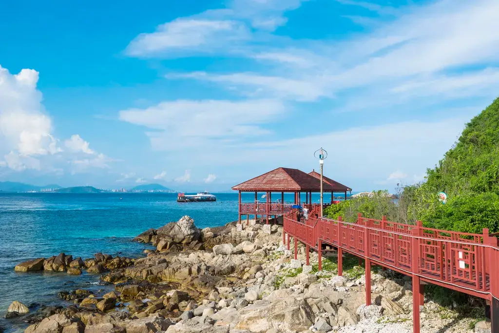 觀光車與City Walk的搭配是解鎖蜈支洲島的絕佳方式,既免去純步行的暴晒與遠途疲憊,又避免全程乘車的走馬觀花,讓探索變得靈活又盡興。隨上隨下的通票覆蓋六大核心站點,觀光車沿環島公路行駛,海風裹挾着熱帶草木的清香撲面而來,沿途可遠眺觀日岩的懸崖峭壁與海浪擊礁的壯闊,輕鬆抵達步行難以觸及的秘境。