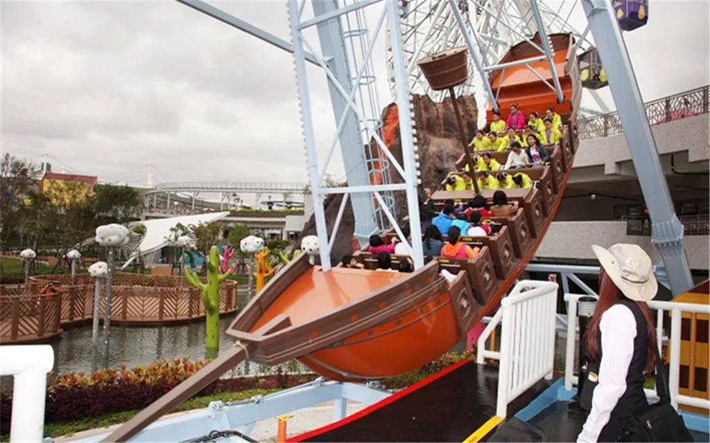 △ 仿木造古戰船的造型,以左右擺盪凌空飛渡,體驗離心力的刺激感。