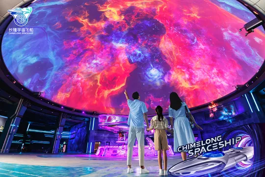 遊客可在“宇宙世界”瞬間進入長隆為遊客打造的奇幻空間,巨型的模擬宇宙空間球幕,帶你登上飛船樂園,進入黑洞穿越星雲,讓大家快速進入想象的主題世界。